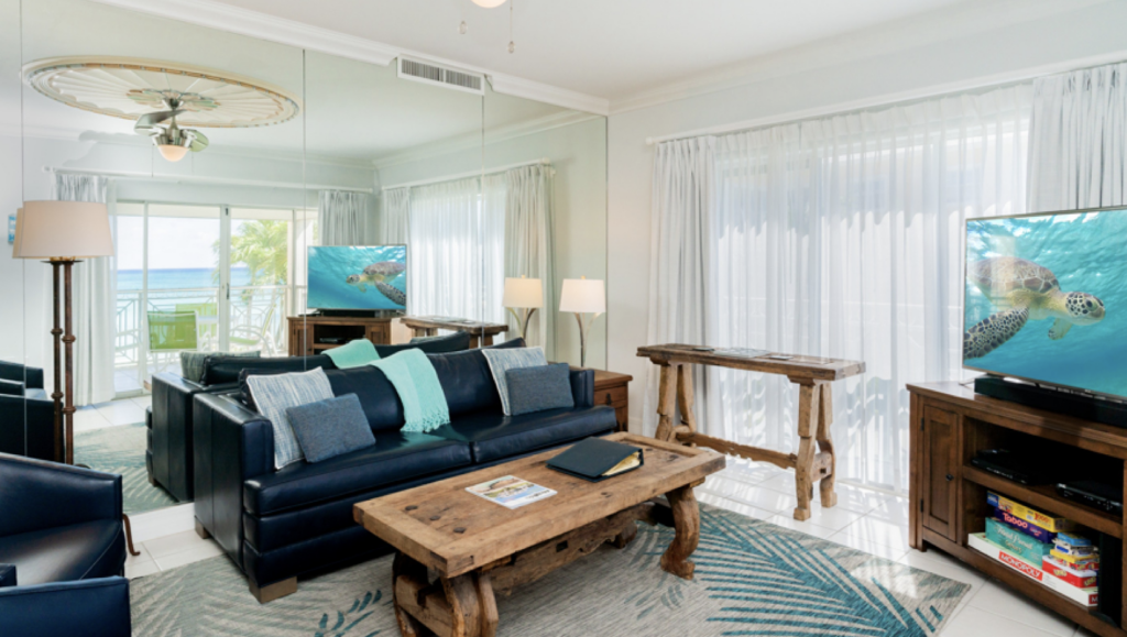 Welcome to Regal Beach Club 623, this second floor 2-bedroom / 2-bathroom condo is grand and elegant and is the perfect place to relax and enjoy the Cayman Islands. The master bedroom is modern with costal sea foam green décor and has a king bed, a flat screen TV and an ensuite bathroom.